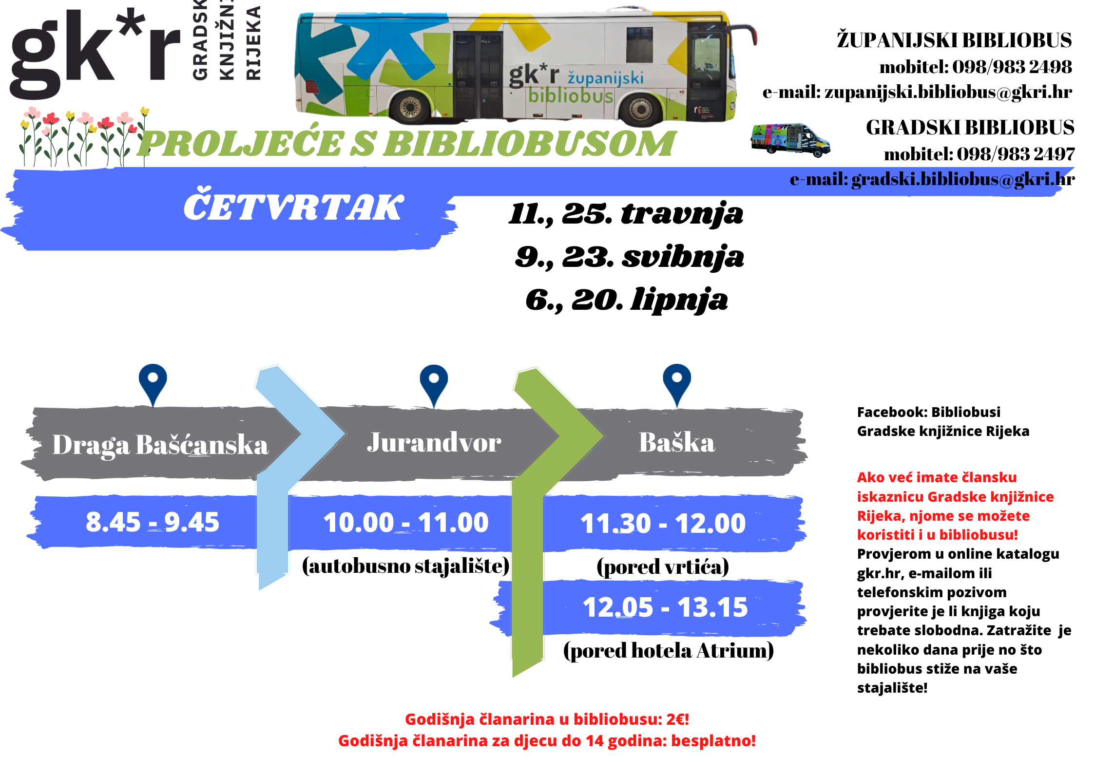 Raspored stajanja Županijskoga bibliobusa u na području općine Baška za travanj, svibanj i lipanj 2024.
